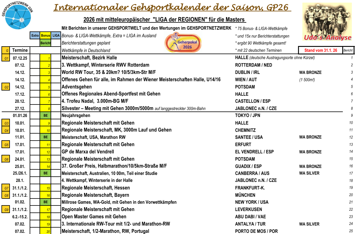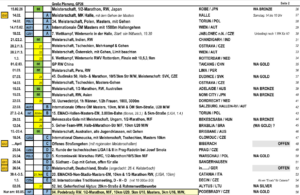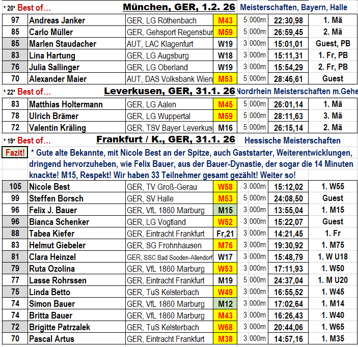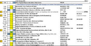 > Leider können wir immer noch nicht unsere Gesamtliste veröffentlichen. Offiziell stehen immer noch nicht gerade die Deutschen Meisterschaften (außer Halle) offiziell fest. Unser Arbeitsplan war auf den 20.1. ausgerichtet. Wir werden trotzdem unseren aktuellen Stand noch zum Monatsende!!! veröffentlichen, damit alle bis Halle weitere Vorhaben planen können.