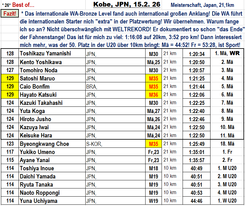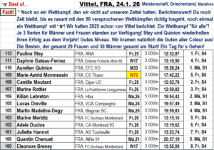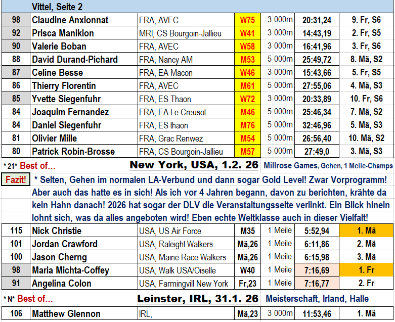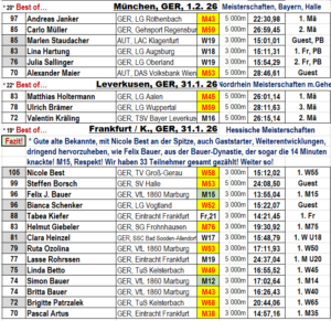 6) Endspurt Januar, mit den schon sehr erwarteten Leistungen von Gehern bei den Landesmeisterschaften. Nun fehlt aus unserer Sicht nur noch das Ergebnis der Masters, 10km, in Porto de Mos, Portugal. Das reichen wir, mit extra Analyse dazu, noch mit Extrabeitrag nach! Es folgen erst einmal unsere Vorstellungen zur kommenden Saison…