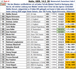 * Liebe Grüße nach Halle! Mit der Veranstaltung in Halle am 14.2. beginnt auch unsere neue LIGA – Saison 2026! Dazu später mehr. Im Vorfeld gab es schon eine Reihe von Veranstaltungen, die als BONUS in die Rangliste einfließen. Der Zeitraum ist seit Jahren immer ab der Auswertung in Erfurt. Die Auswertung 2025 war zugleich der Start in die neue Saison. Ab 1.1. werten wir (neu) nicht mehr alle, sondern nur noch die auf der Gesamtliste (aktuell 92 Termine) aufgeführten Wettkämpfe. Berücksichtigt wurden: