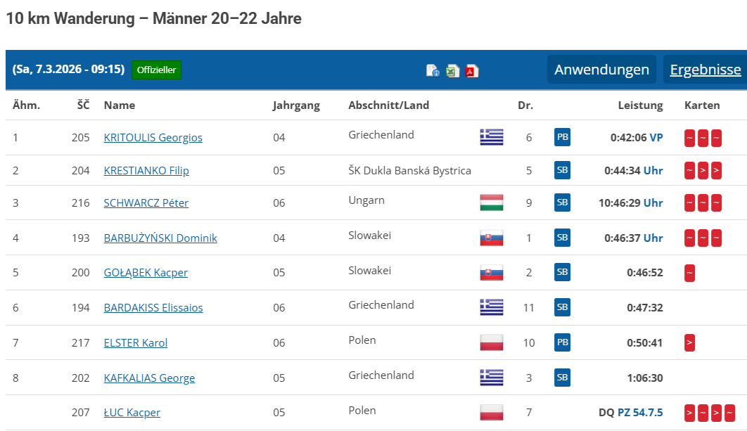 * Zu Wien gibt es viele Extra-Informationen, von denen ich gerne ein paar weiter gebe: Alles, deutlich überstrahlt von der epochalen Leistung einer Theresia Mohr. Sie bricht einen 31 Jahre alten Rekord. Mit knapp 19 Jahren. Nur die Spitze einer Entwicklung von Nachwuchs in unserem Nachbarland. Die Zahl der Neulinge in den letzten beiden Jahren übersteigt die Änderungen der 10 Jahre davor. Alles mit einer GEHSPORTKOMMISSION! Und die weiß, was sie tut: a) Wettkampfkalender steht drei Monate (oder eher!) vor dem jeweils kommenden Jahr! b) Sichtbarer Einfluß auf neue Vereine, interessierte Athleten, Angeboten, großem Engagement sowie Aus- und Weiterbildung. Die Bedingungen für das revolutionäre Ergebnis bei diesen Meisterschaften waren nicht ideal! Nur der 24-jährige „Jungspunt“ Thomas Holleger, der den Durchschnitt der drei Medaillengewinner gleich um 10 Jahre senkte, errang seinen Meistertitel relativ unspektakulär! Die beiden Jugendlichen! im weiblichen Bereich stellten sich erfolgreich schwierigen Umständen. Theresa Mohr mußte sich vor dem Start lange dem Vorwurf stellen, die falschen Schuhe zu benutzen. Erst paar Machtworte, die sich auf das 20-seitige Statement der WA dazu bezogen, bis 40mm Schuhhöhe an der Hacke sind erlaubt, sicherten schlußendlich ihren Start! Auch die Zweite, Marlen Staudacher, hatte mit vielen Umständen während des Wettkampfes zu kämpfen! Was weiß, was unter besseren Umständen heraus gekommen wäre. Während des Wettkampfes wurde sie als Zweite des gesamten Feldes plötzlich auf dem letzten Platz „erkannt“. Weil auf notwendiger „Strichliste“ wohl GLEICH 2 Runden fehlten? Auch hier war ordnender Einfluß dringend nötig, um aus der Veranstaltung das zu machen, was es war! Eine epochale Veranstltung für das Gehen. Und bitte nicht die falschen Schlüsse ziehen! Ein überschaubares Feld (5 Frauen, 4 Männer) nicht trennen (wollen)! Ursachen bekämpfen. Rundenzählen nicht „als nebenbei“ und als „notwendiges Übel“ betrachten. Neben Wien folgen noch Daten zu Rotterdam und Clermont-Ferrand: