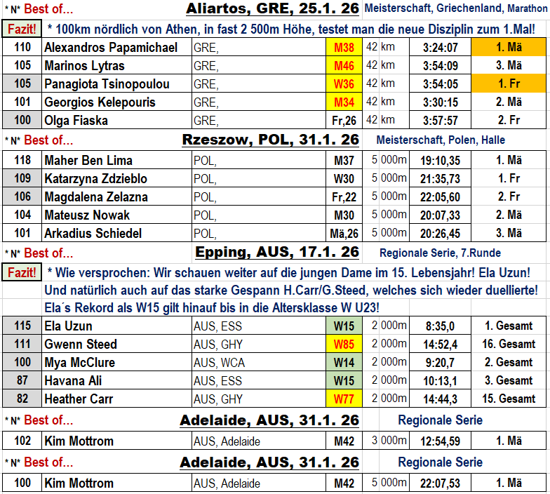 * Jetzt folgt der große Australienblock. Zusammenfassung großer Leistungen, regional super aufgestellt, aus über 100 Wettkämpfen die besten Leistungen in 20 Wettkämpfen herausgesucht. Etwas Wehmut kommt auf. Nicht mehr so, wie in den letzten 11 Jahren zu berichten! Aber die große Talente-Show, mit Ela Uzun an der Spitze, werden wir, nun auch etwas unaufgeregter, weiterverfolgen. Hier die TOP-Ergebnisse der letzten Wochen: