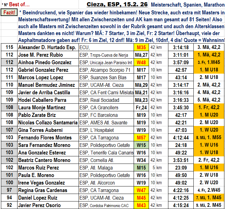 * Wen es noch interessiert, die Gesamt – Beteiligung der Veranstaltung in Cieza: M U16, 35 Starter, M U18, 34 Starter, M U20, 16 Starter, W U16, 64 Starter!!, W U18, 51 Starter, W U20, 29 Starter, Marathon, Mä: 27 Starter, Fr: 18 Starterinnen! Bei den Männern, so starke, interessante Leute wie: Daniel Chamosa Dacasa, Daniel Monfort Moreno, Eider Arevalo, COL bei den Aufgebenden! Oder bei den Masters Juan Pasodoles, M60, der schon entnervt bei km17 in 1:35:54h den Asphaltbelag der Strecke verließ. Insgesamt 274 Aktive am Start! 35 Aufgaben = 12,8% und 9 Disqualifikationen = 3,3%!